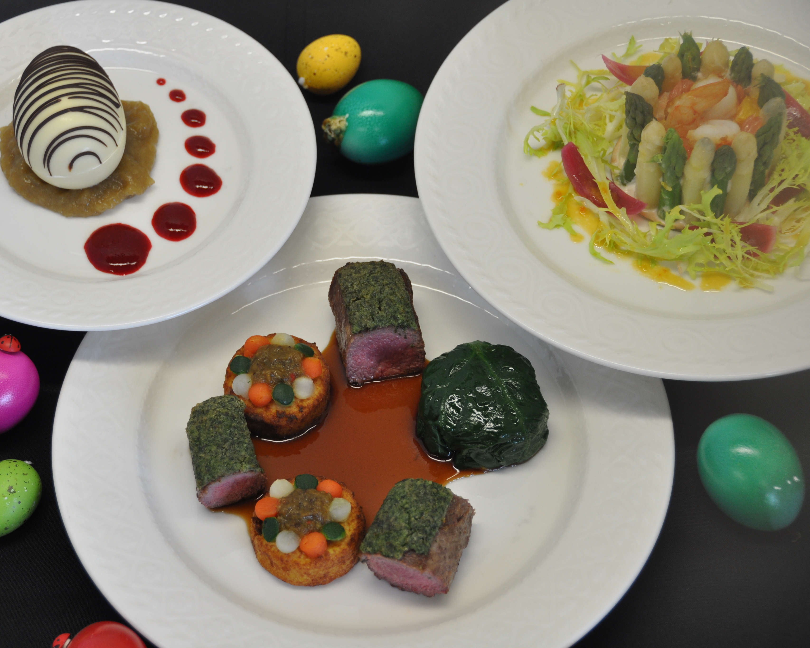 Plat : Filet d’agneau en croûte de persil avec son jus au romarin, polenta aux épices et petits légumes ainsi que sa chartreuse d’épinards à la ratatouille niçoise